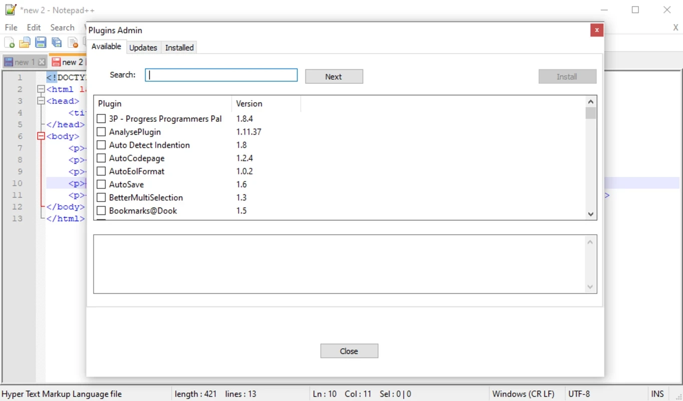 If you are managing text documents and want to work on any selected section, the app offers a search and replace option for your ease. You need to click on the ‘Search’ section and select the ‘Find’ or ‘Replace’ option. In addition, you also enhance the functionality while navigating to ‘Plugin Manager’, and install the plugins you want.